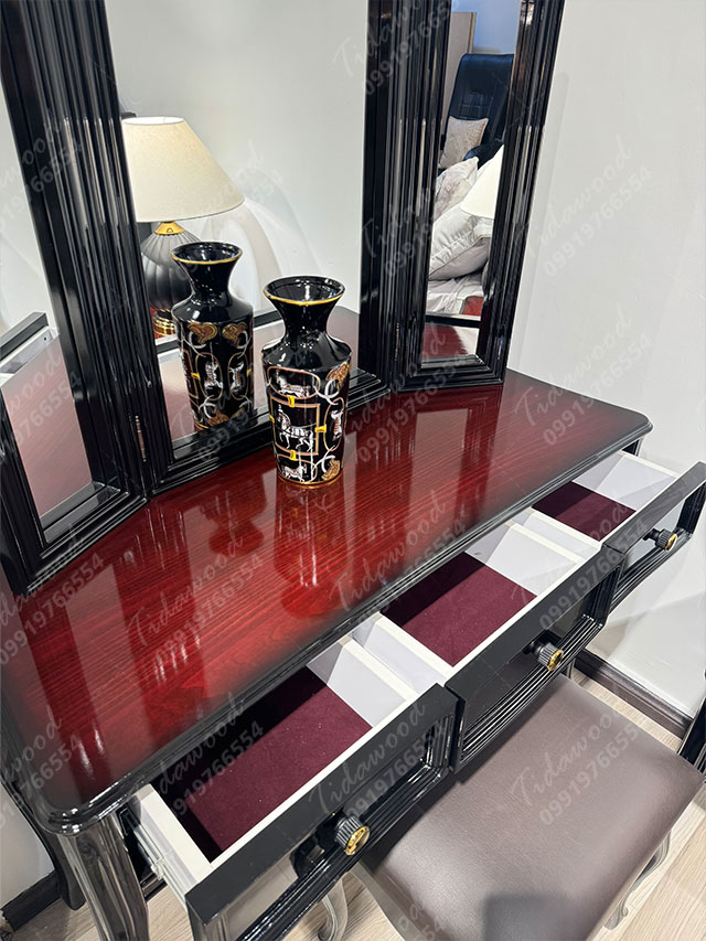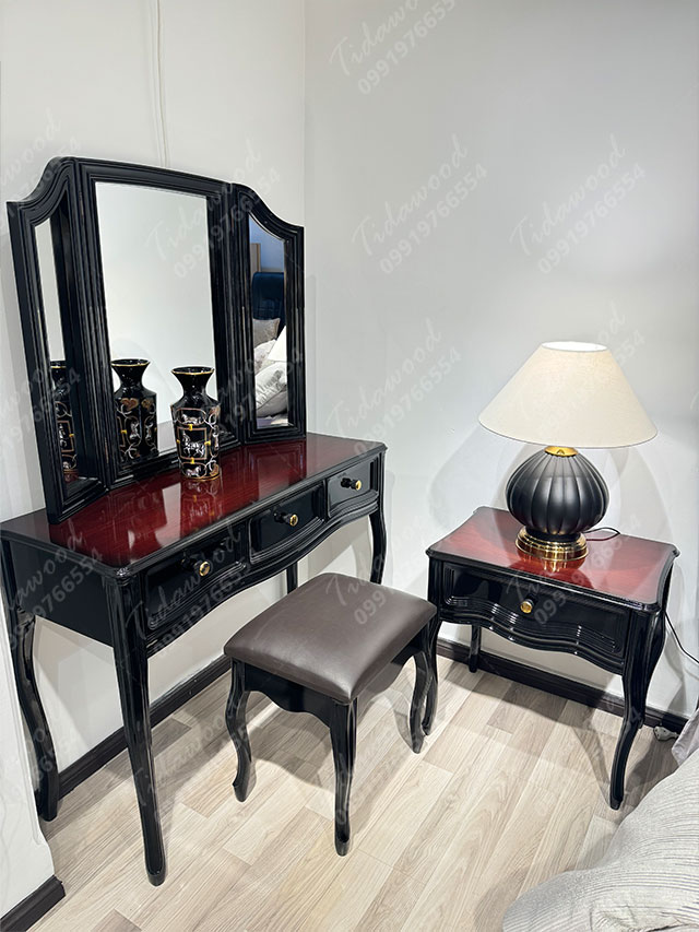 رنگ سرویس مشکی و صفحه میز آرایش و کنار تختی ماهگونی میباشد.